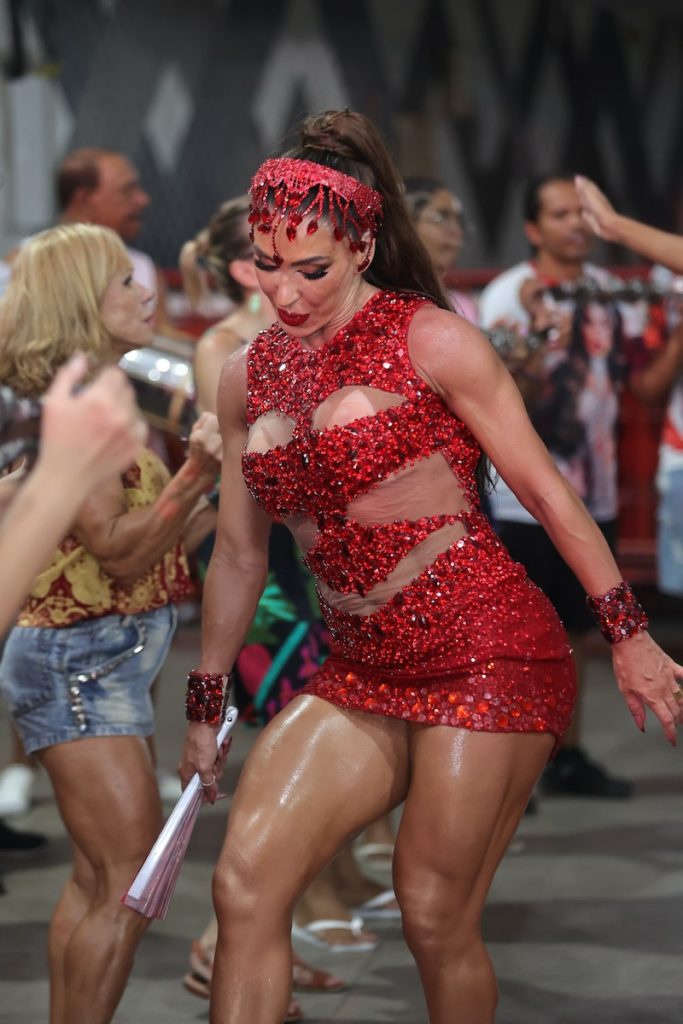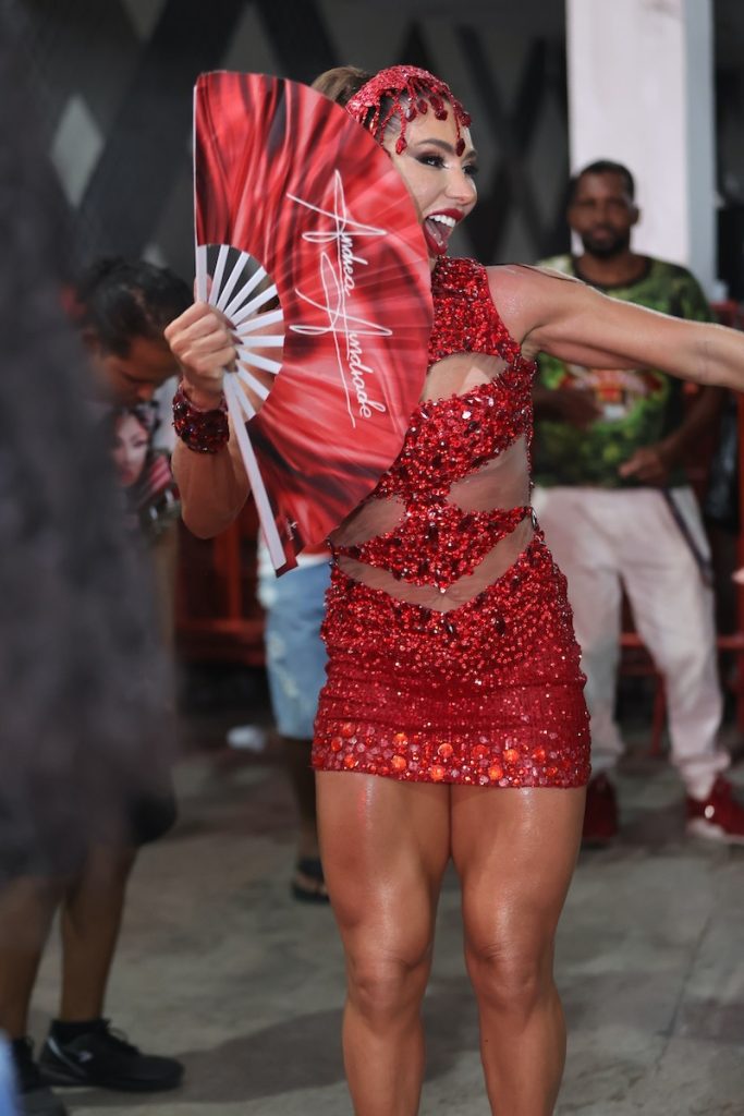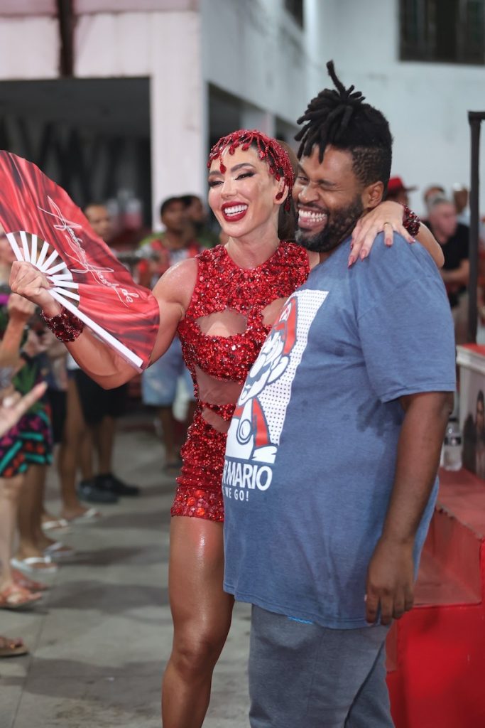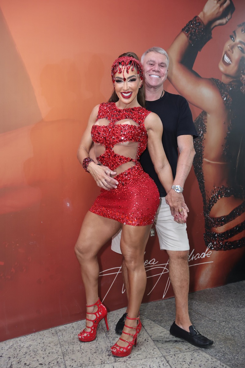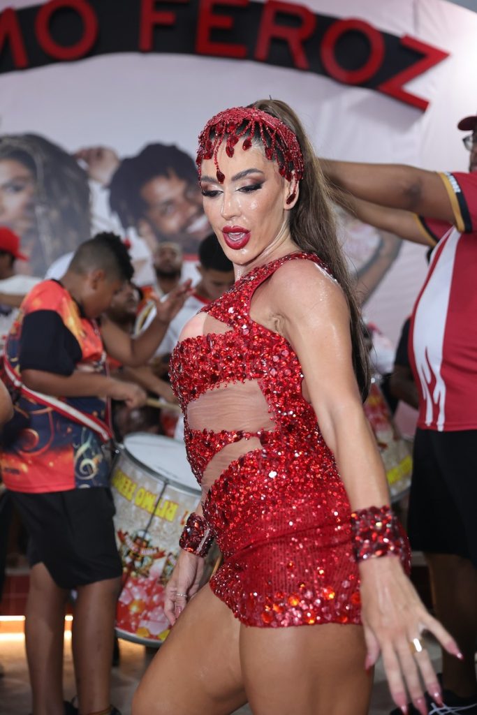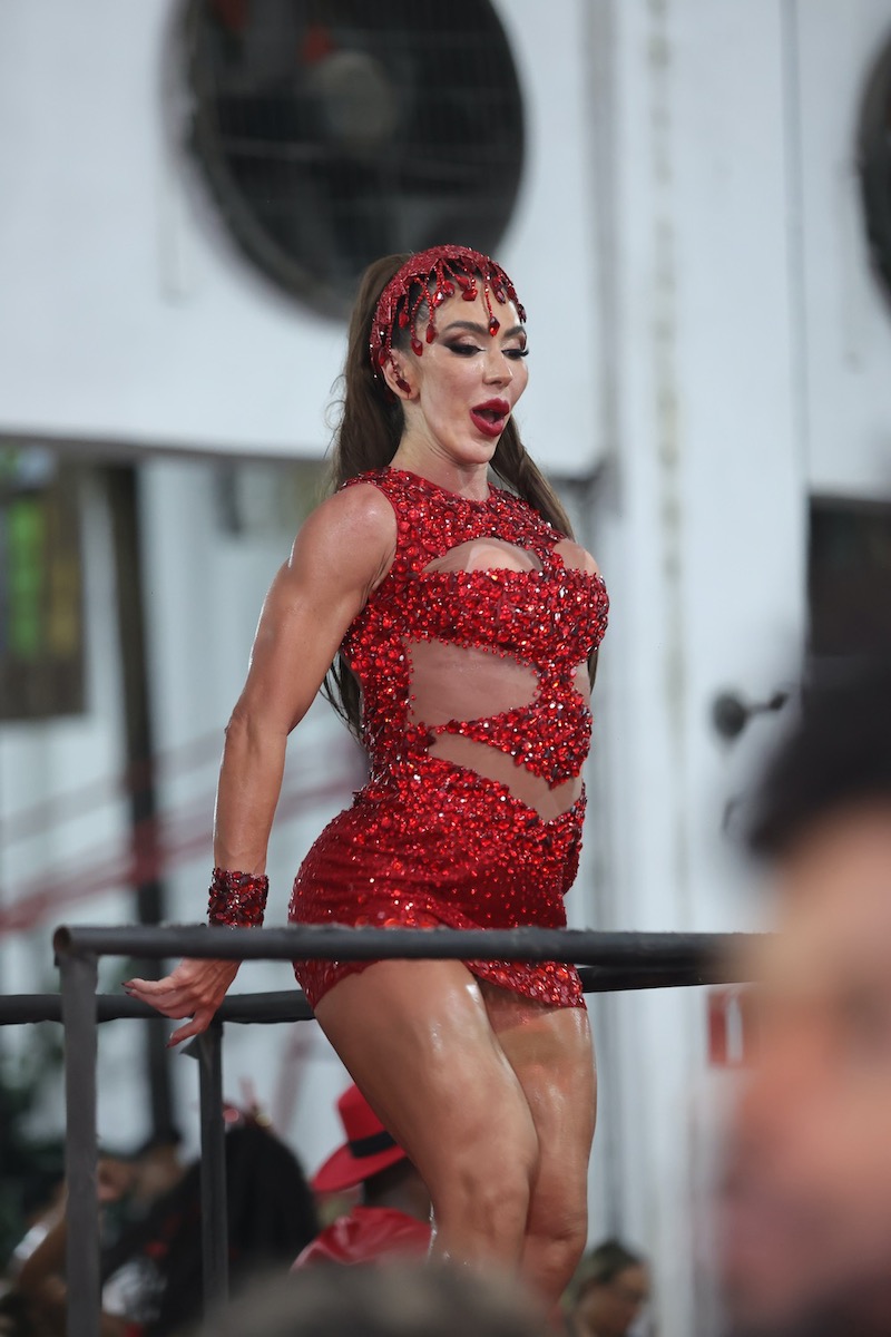 O figurino vermelho, uma das cores da escola de samba de São Gonçalo, valorizou o corpo sarado da influenciadora, que está sempre presente nos ensaios. Andrea também recebeu os seus convidados em seu camarim.