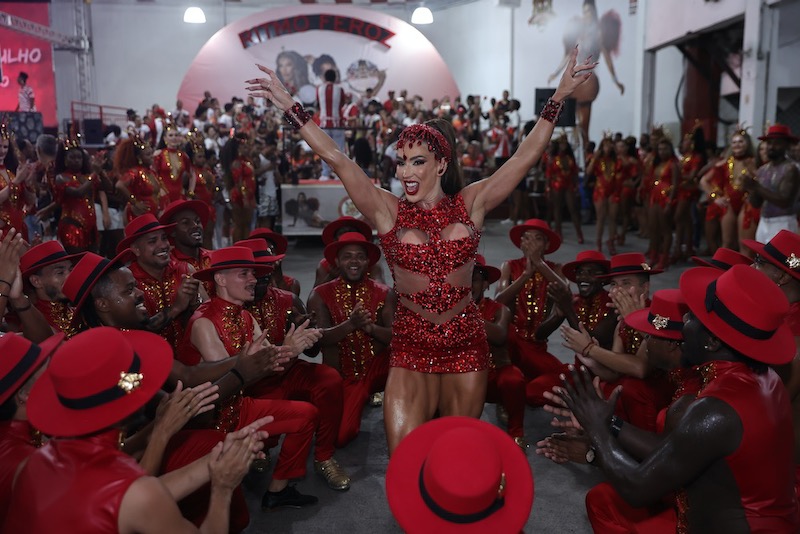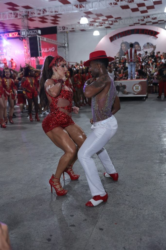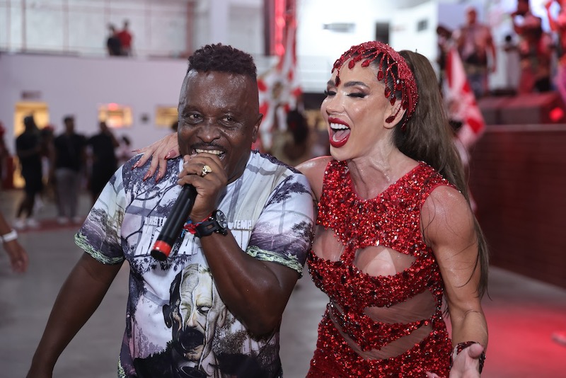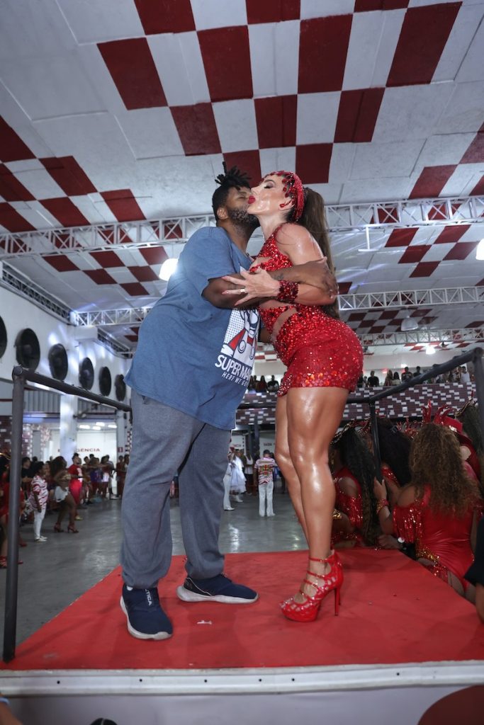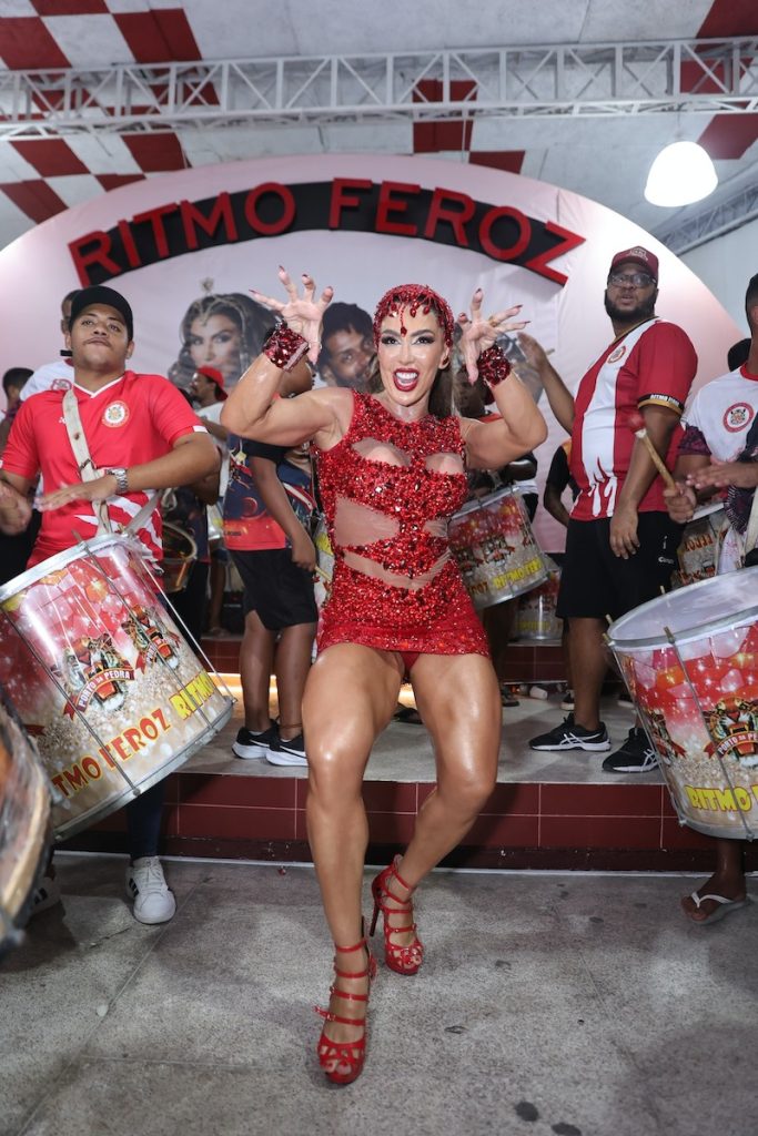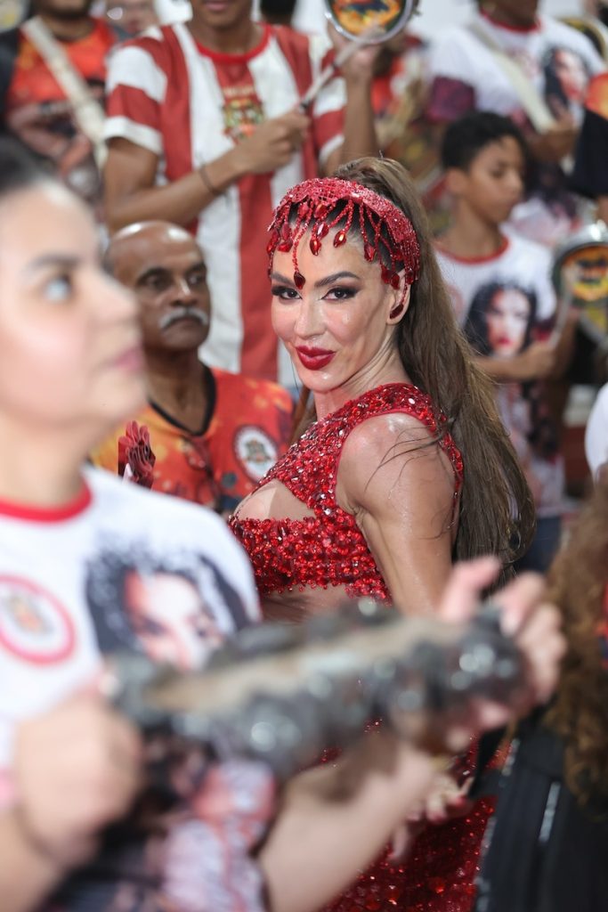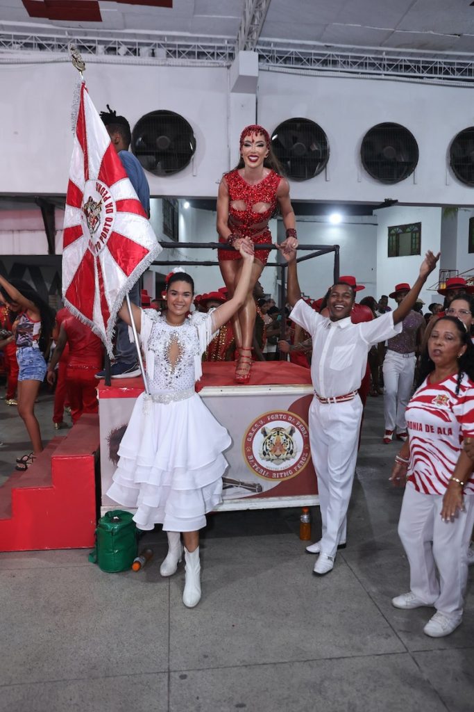 O figurino vermelho, uma das cores da escola de samba de São Gonçalo, valorizou o corpo sarado da influenciadora, que está sempre presente nos ensaios. Andrea também recebeu os seus convidados em seu camarim.