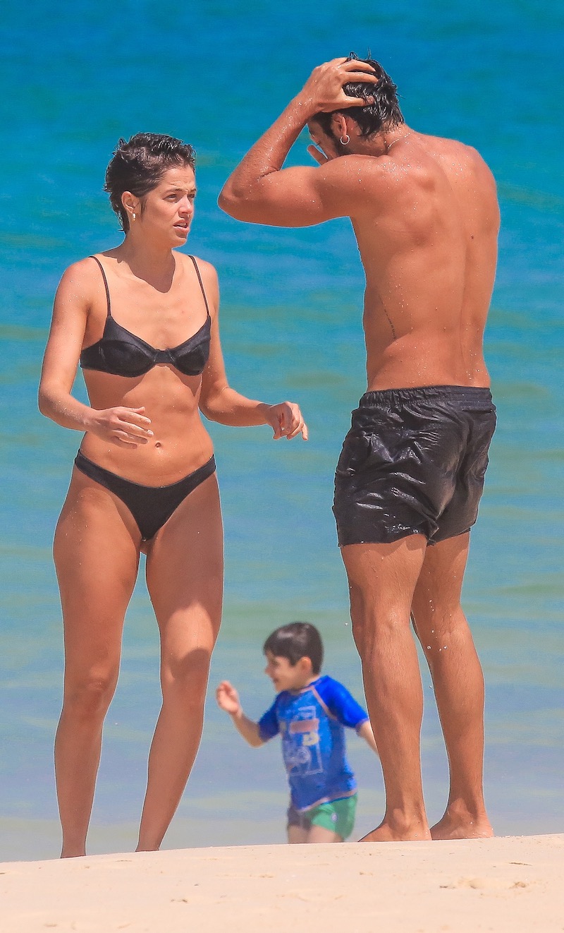 No ar na novela Mania de Você, Agatha Moreira aproveita manhã de folga para renovar o bronzeado em uma praia junto com Rodrigo Simas