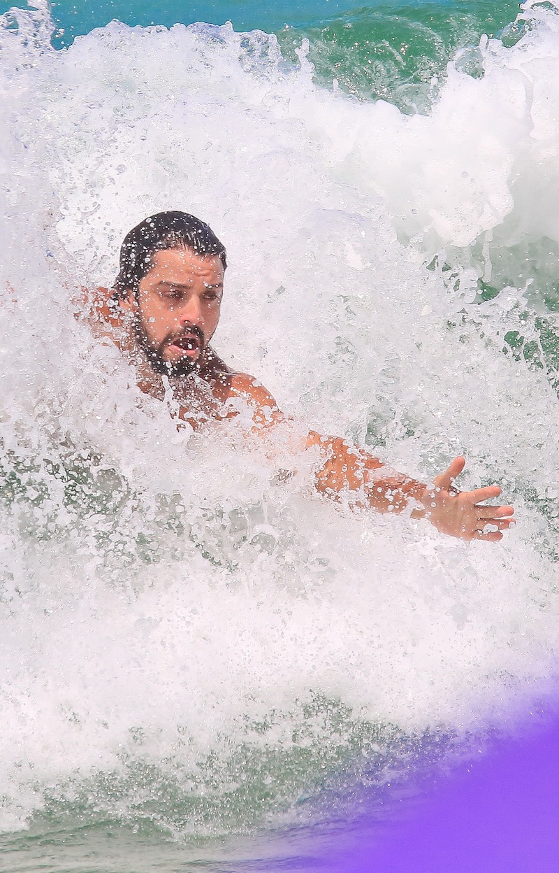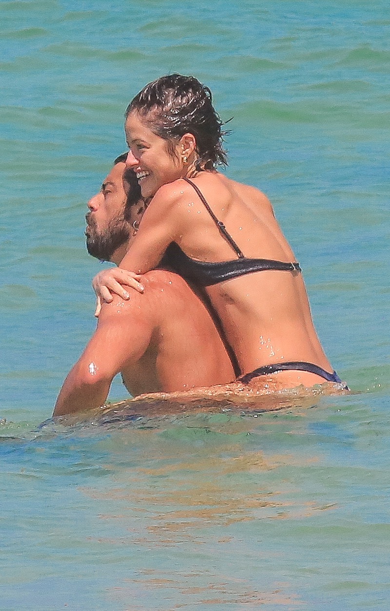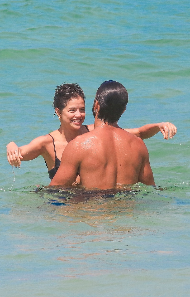 Com muitos abraços e beijos no meio do mar, casal acenou para as fotos na Barra da Tijuca, Zona Oeste da Cidade Maravilhosa, nesta quarta-feira (25).