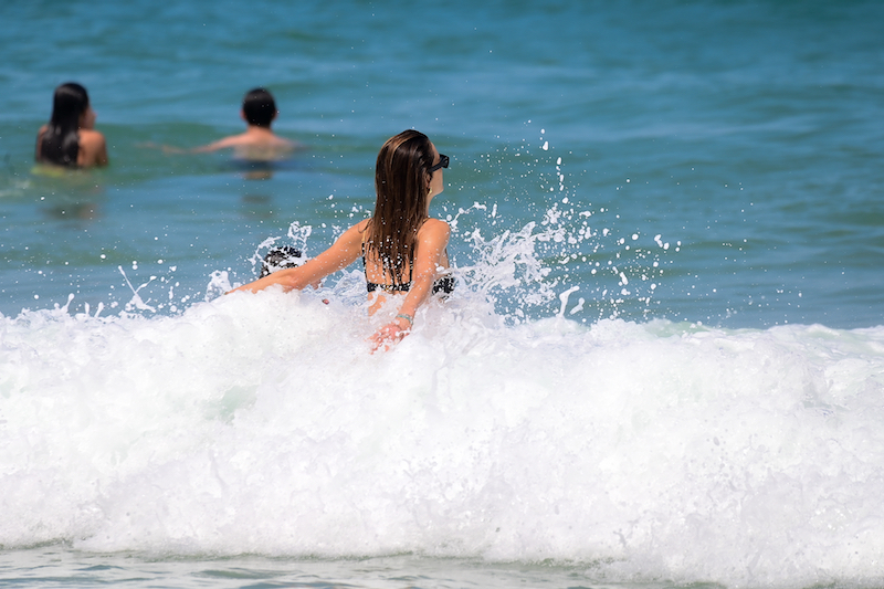 Ela fez da praia sua passarela depois de um mergulho no oceano, exibindo seu abdômen definido enquanto a água pingava sobre seu corpo em forma.