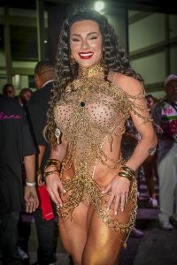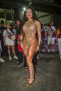A apresentadora usou um body cavado, feito à mão com correntes douradas, pedrarias e cristais. A vestimenta representava a Deusa do Ouro, Oxum, tema do enredo da agremiação para 2026: “ORO MI MAIÓ OXUM”.