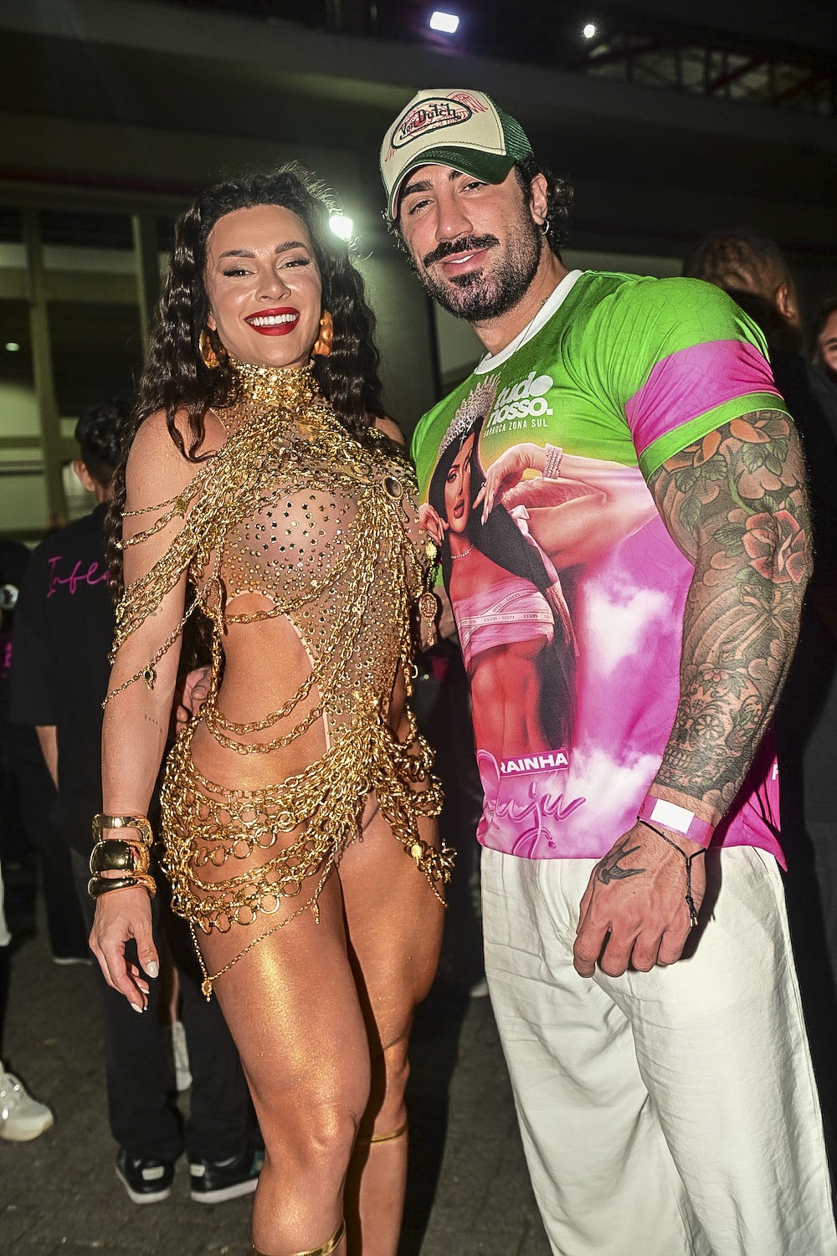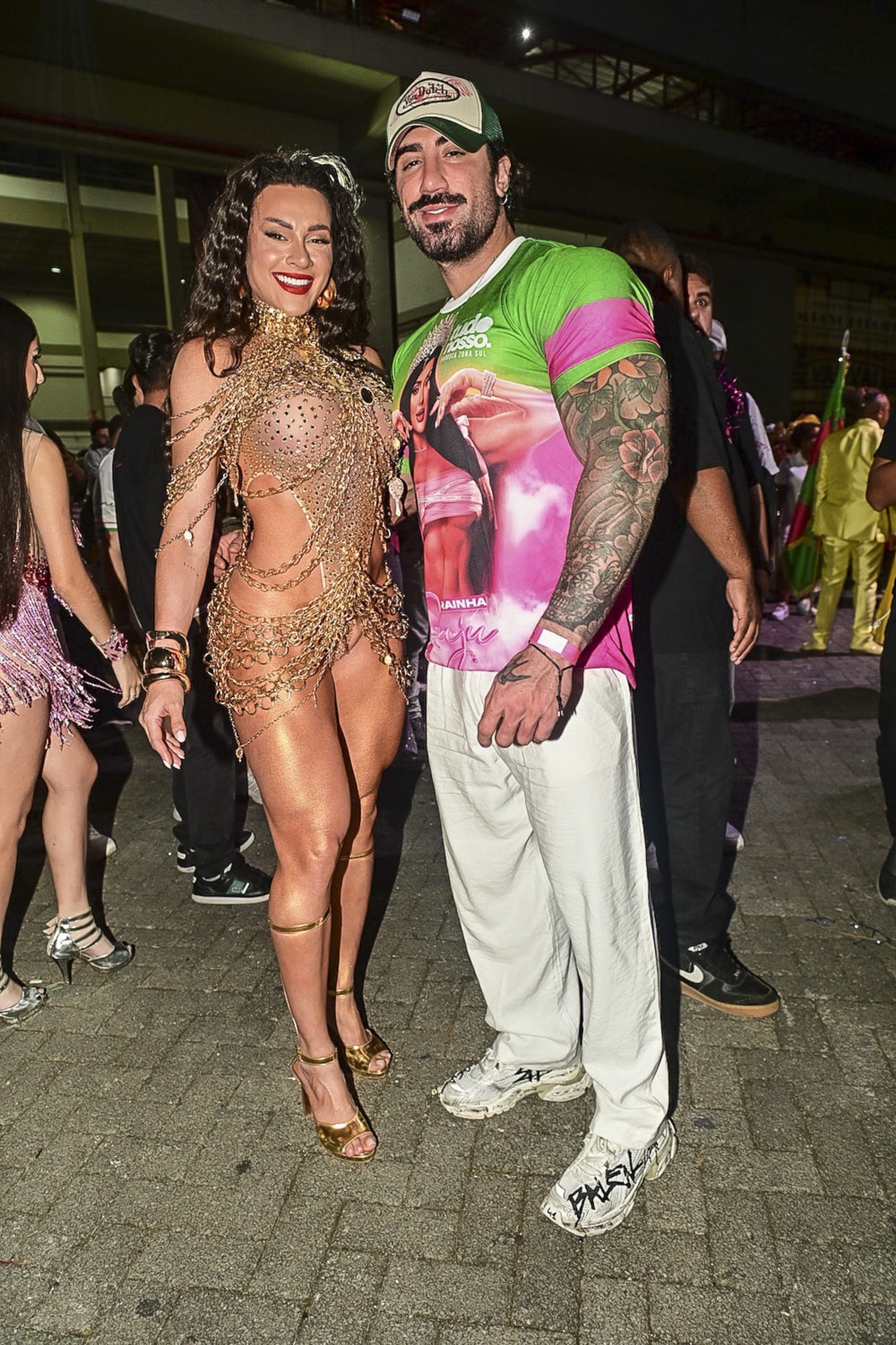 Assinado pelo estilista Kell Mendes, o look valorizou o físico sarado de Juju e foi um dos destaques da noite. Juju, que já havia usado um macacão dourado avaliado em R$ 15 mil em outro evento da escola no mês de novembro, esbanjou samba no pé e carisma ao lado do noivo, Diogo Basaglia.
