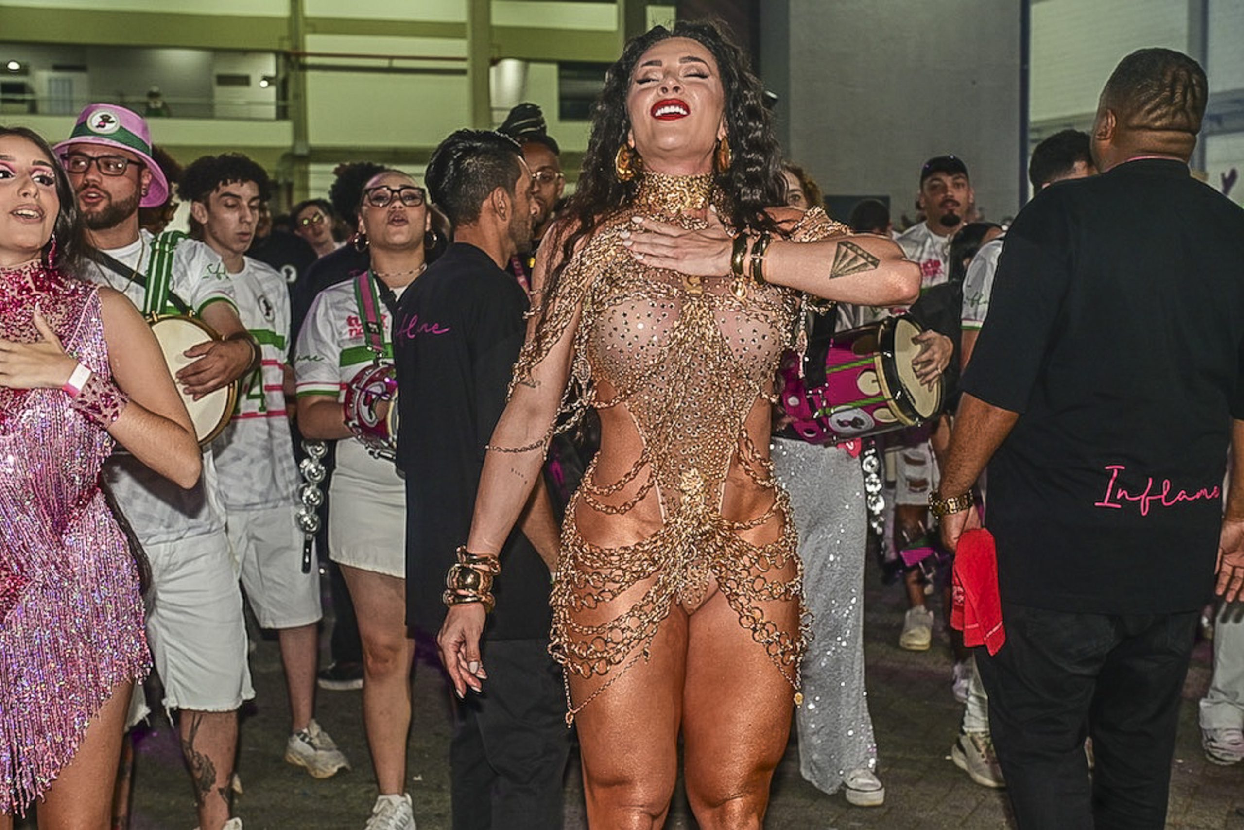 A apresentadora usou um body cavado, feito à mão com correntes douradas, pedrarias e cristais. A vestimenta representava a Deusa do Ouro, Oxum, tema do enredo da agremiação para 2026: “ORO MI MAIÓ OXUM”.