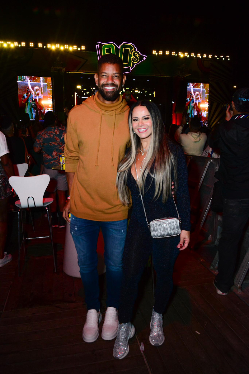 Para curtir a festa, a rainha de bateria do Salgueiro, de 49 anos, foi com um macacão justinho brilhoso, combinado com jaqueta de couro e bolsa dourada. Já o marido dela, que tem 35, escolheu o combo moletom + calça jeans.