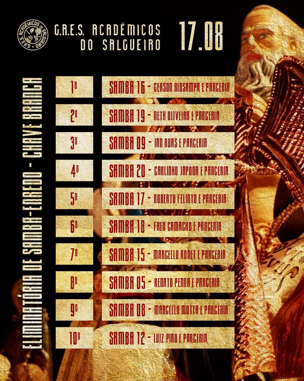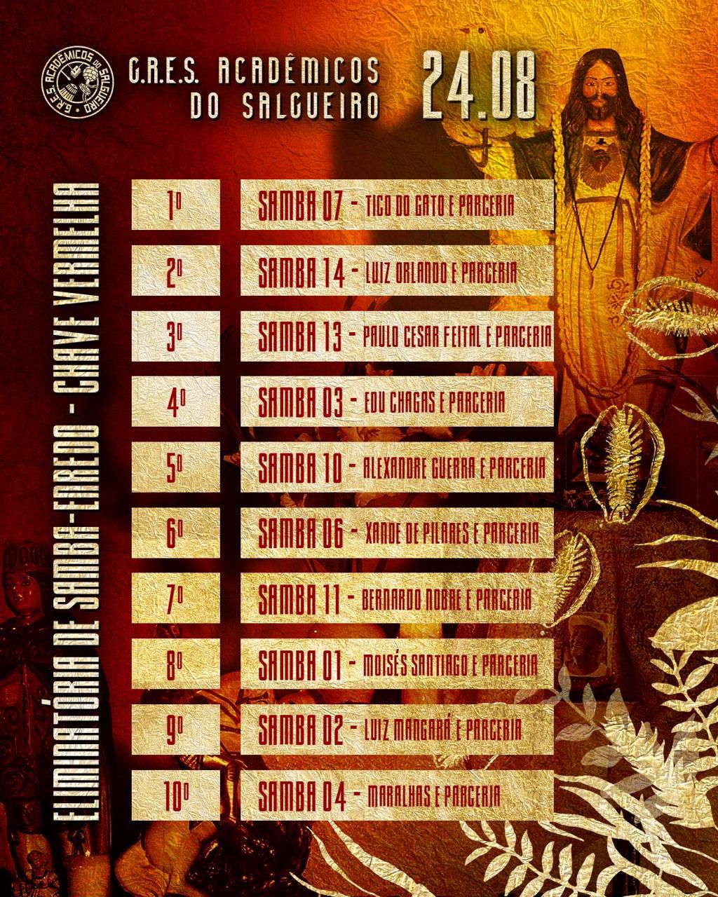 As obras foram divididas em duas chaves, branca e vermelha, e serão apresentadas nos próximos dois sábados, 17 e 24 de agosto. A disputa segue até 11 de outubro, quando o hino oficial para o Carnaval 2025 será definido. Todos os sambas estão disponíveis no canala da escola, SALGUEIRO TV.