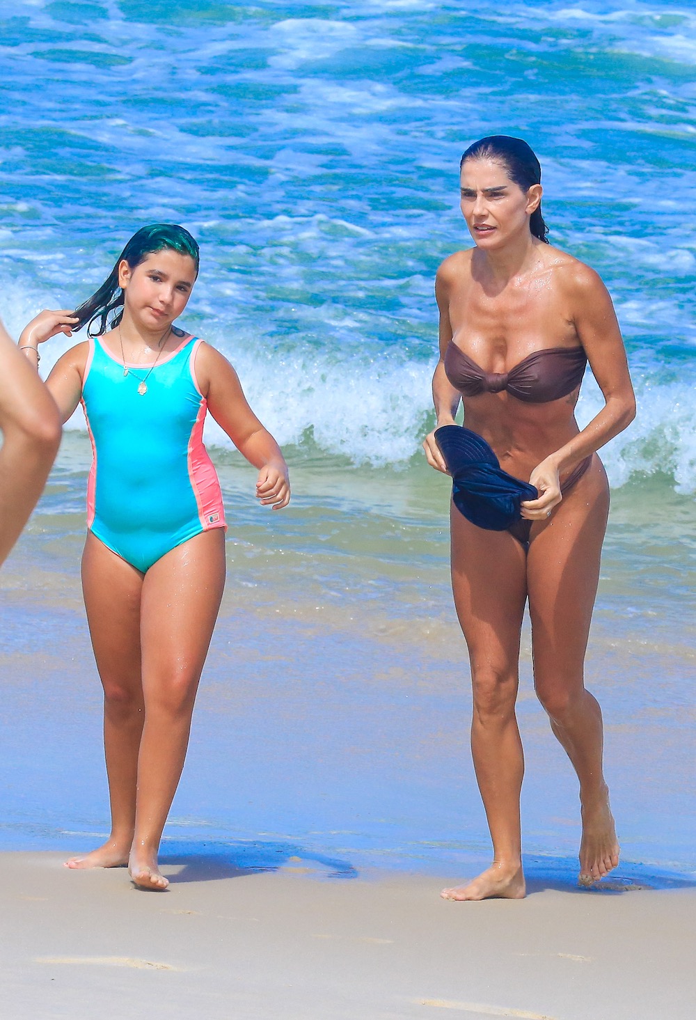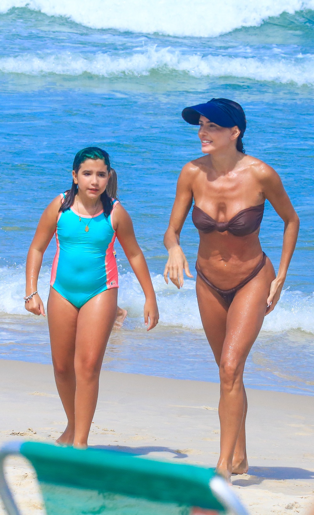 A atriz arrasou com um biquíni tomara que caia na cor marrom, enquanto a pequena estava com um maiô rosa e azul.