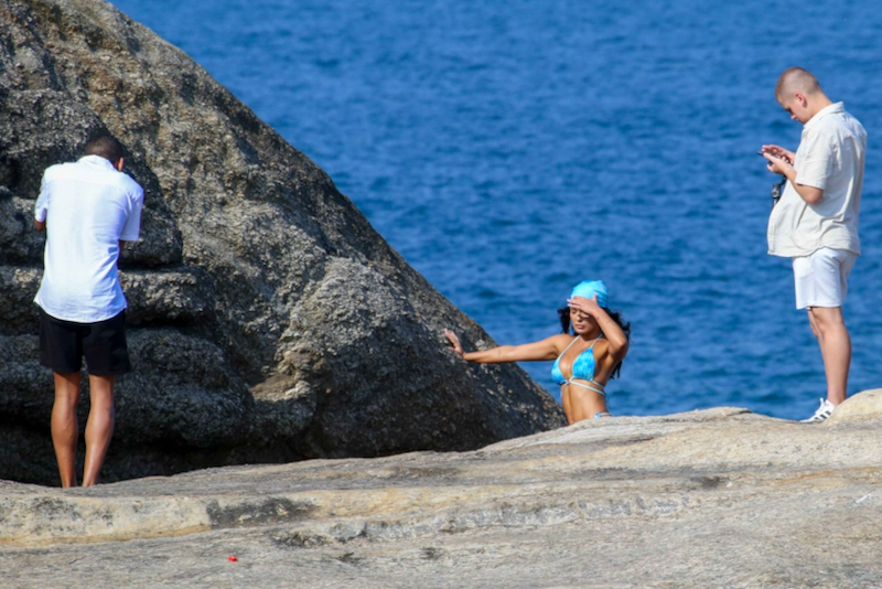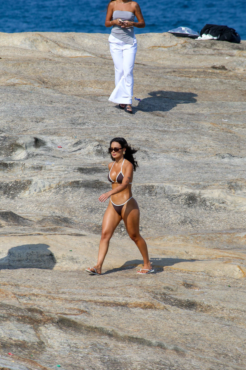 A ex-BBB Larissa Santos foi vista nesta quarta-feira (11) fazendo um ensaio de fotos em um dos cartões postais do Rio de Janeiro, a pedra do Arpoador, na Zona Sul da cidade. O clima é de muito sol, os termômetros marcam mais de 30 °C, em Ipanema. Vestindo um biquíni azul-claro com a técnica tie-dye, a influenciadora exibe o tanquinho e posa para as lentes do fotógrafo.