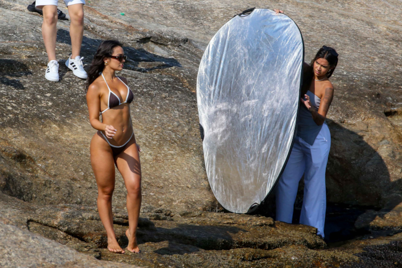 Ao longo do ensaio, Larissa trocou de looks algumas vezes. Ela usou uma produção na cor azul, com direito a lenço na cabeça, e também arrasou com um biquíni fio-dental nas cores marrom e branco e óculos escuros.