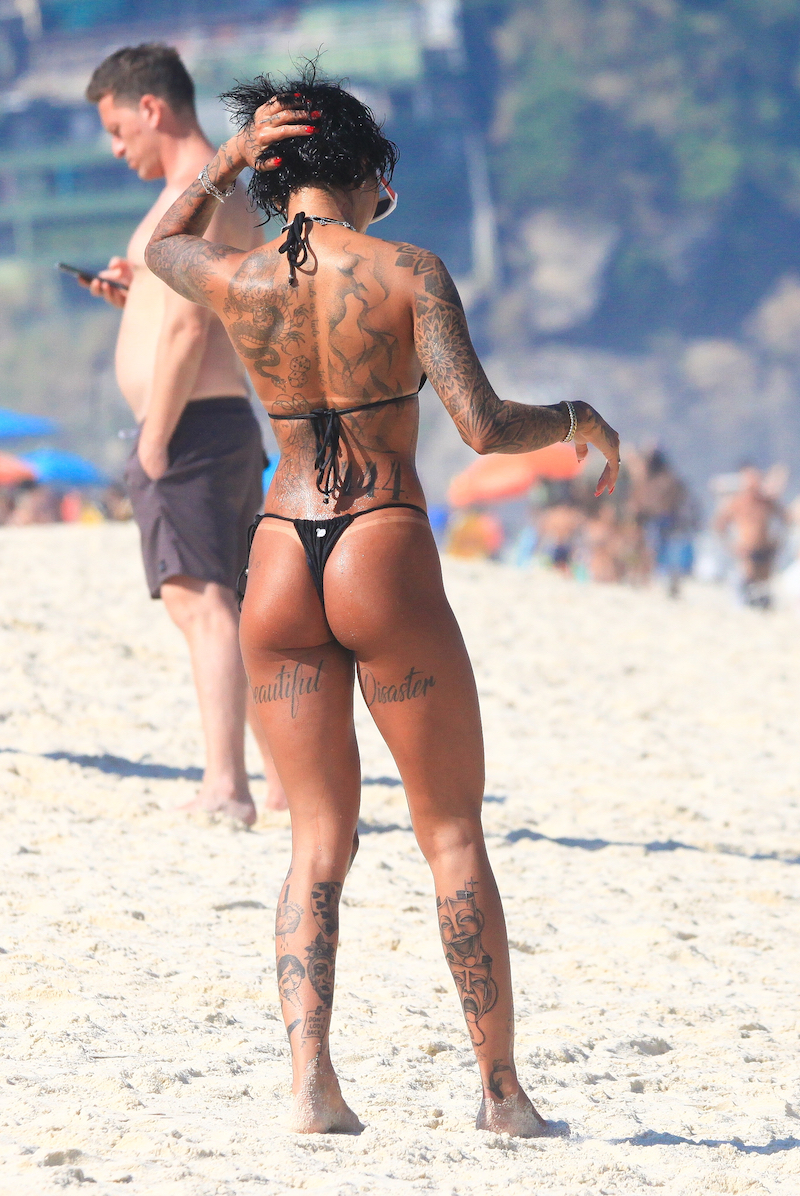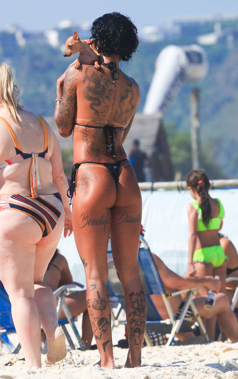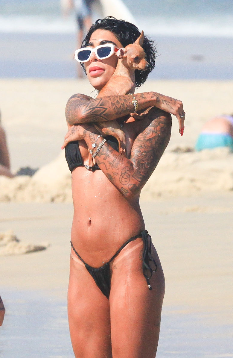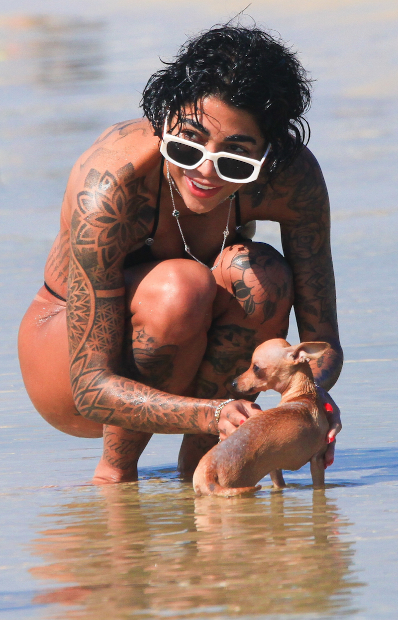 Dhiovanna Barbosa, faz carinho a cãozinho e exibe visual radical em dia de praia no Rio