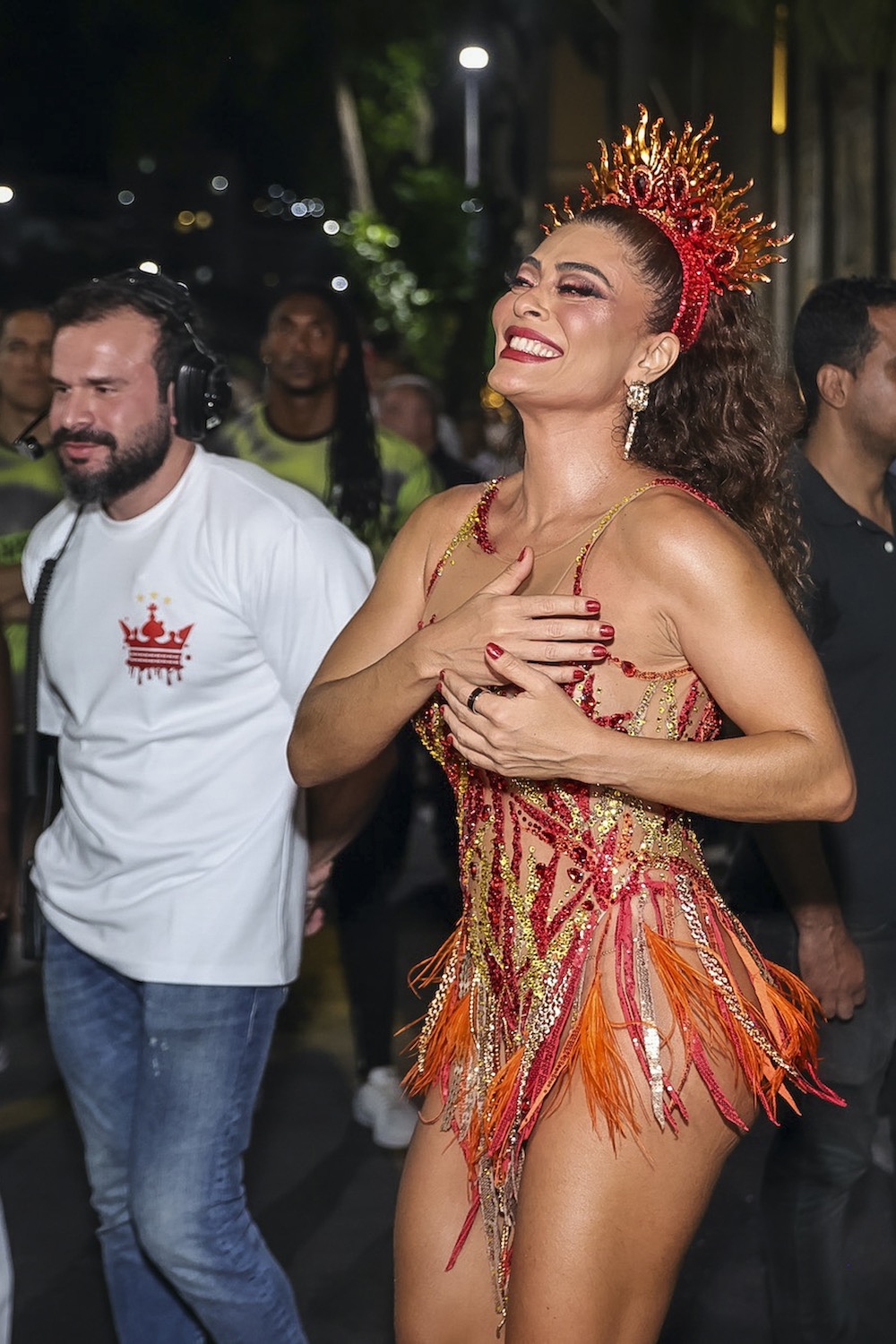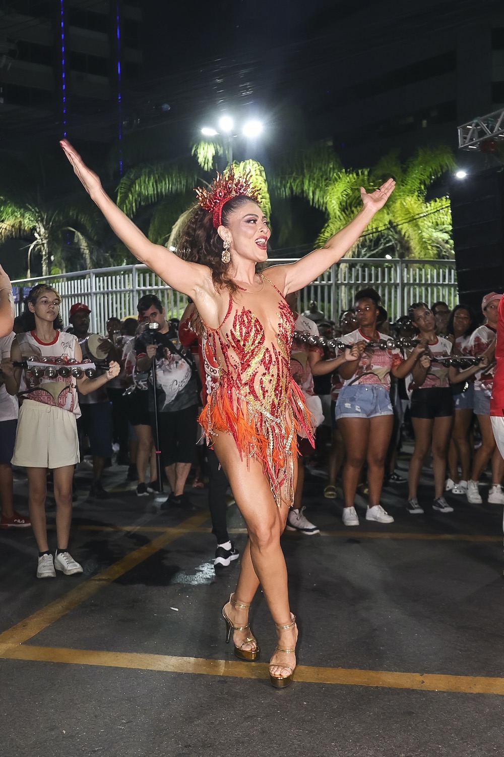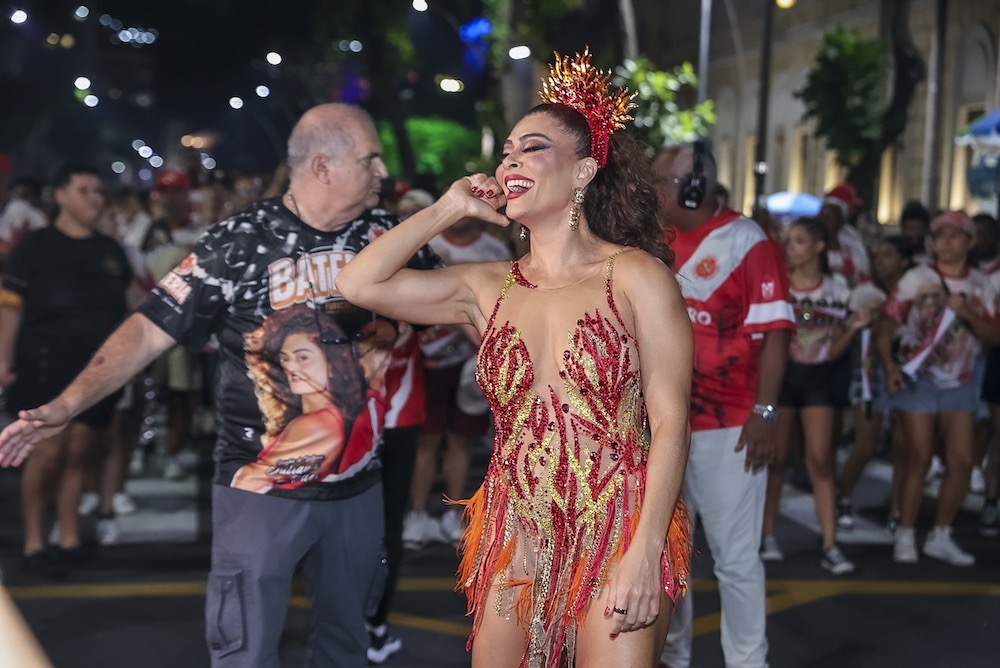 Juliana Paes brilha em ensaio de rua da Viradouro com simpatia