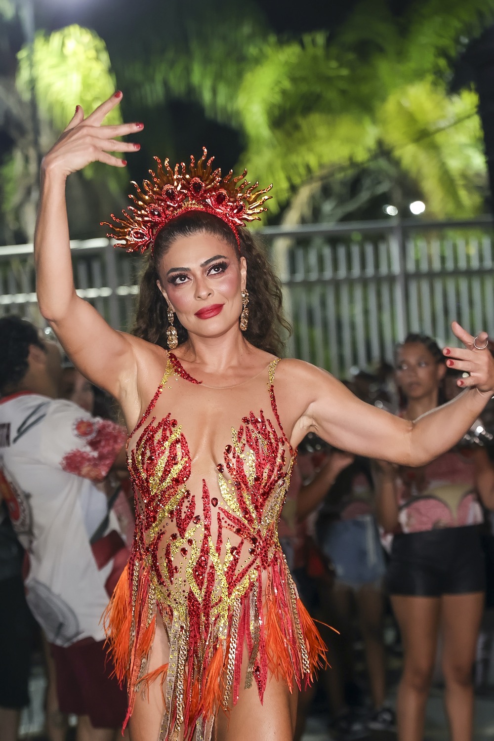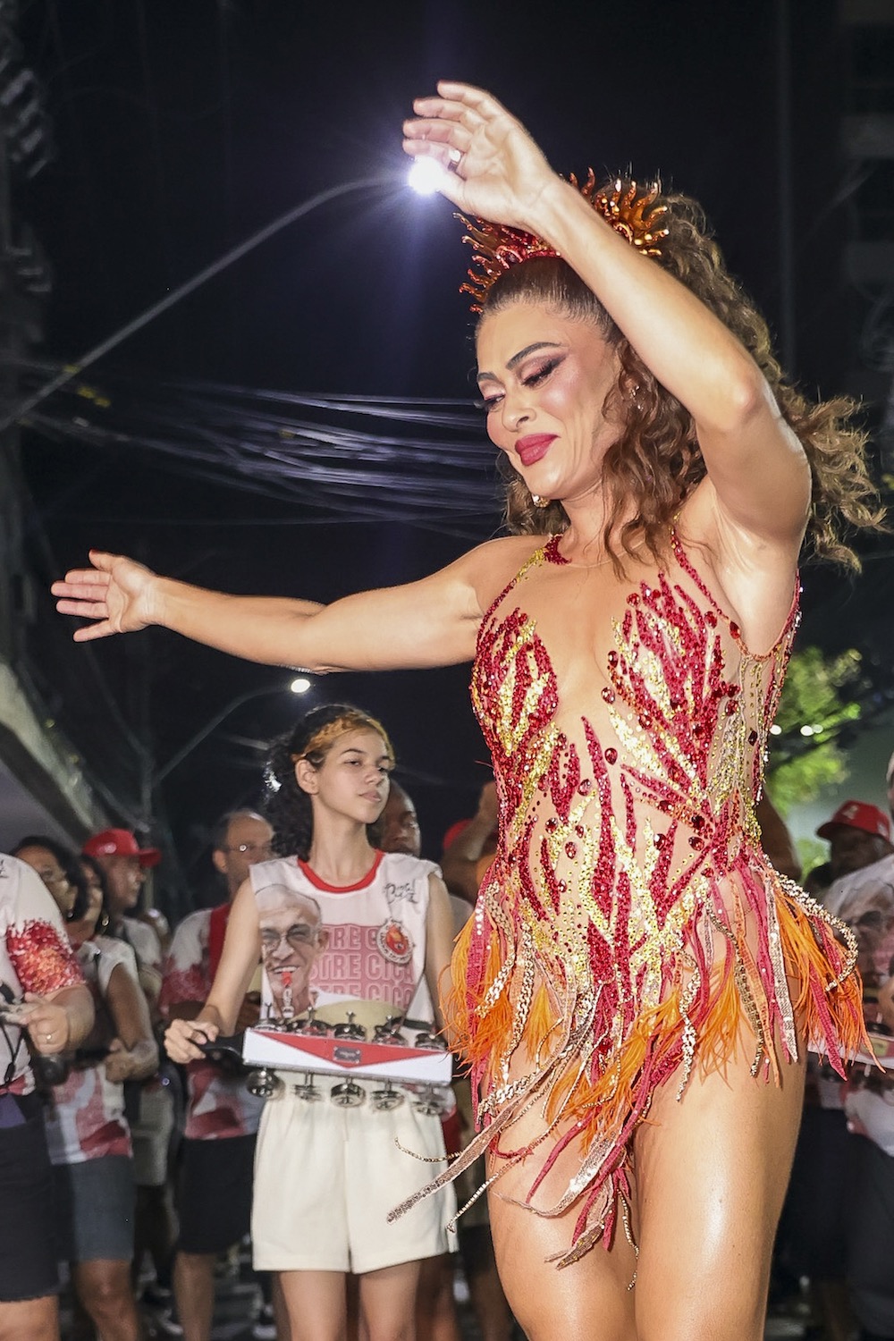 Juliana Paes, aos 46 anos, fez uma aparição marcante no ensaio de rua da Viradouro, realizado no último domingo, 16 de novembro. A atriz, que é um dos principais destaques da escola de samba, voltou a ocupar o posto de rainha de bateria após a saída de Erika Januza, que ocupou a posição durante quatro carnavais. O evento, que celebra o enredo sobre o Mestre Ciça, contou com a participação vibrante da comunidade.