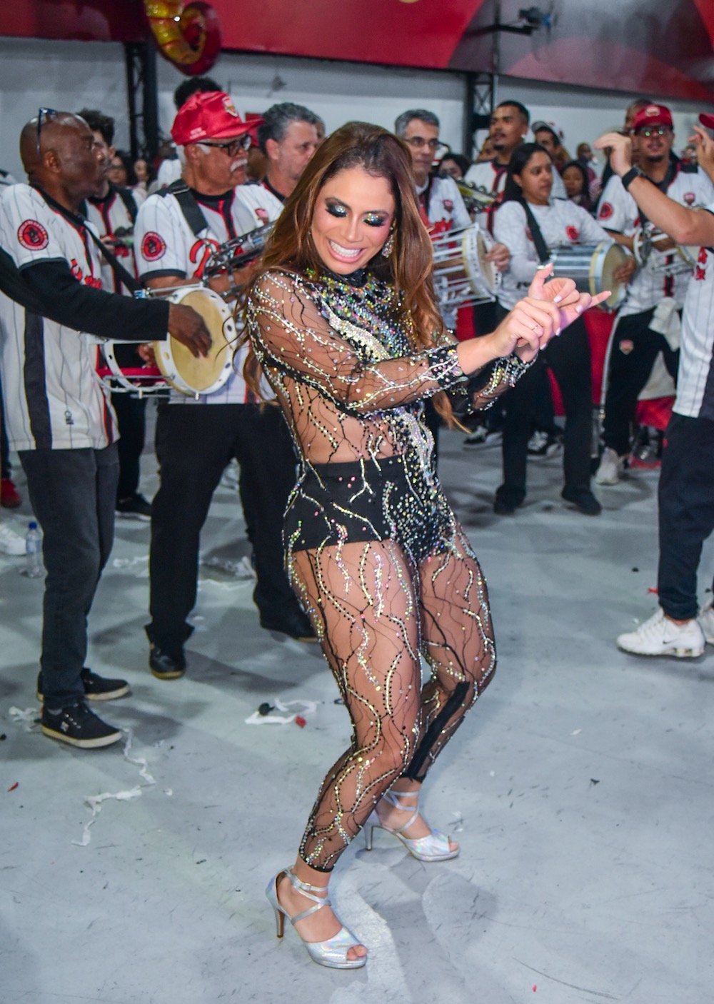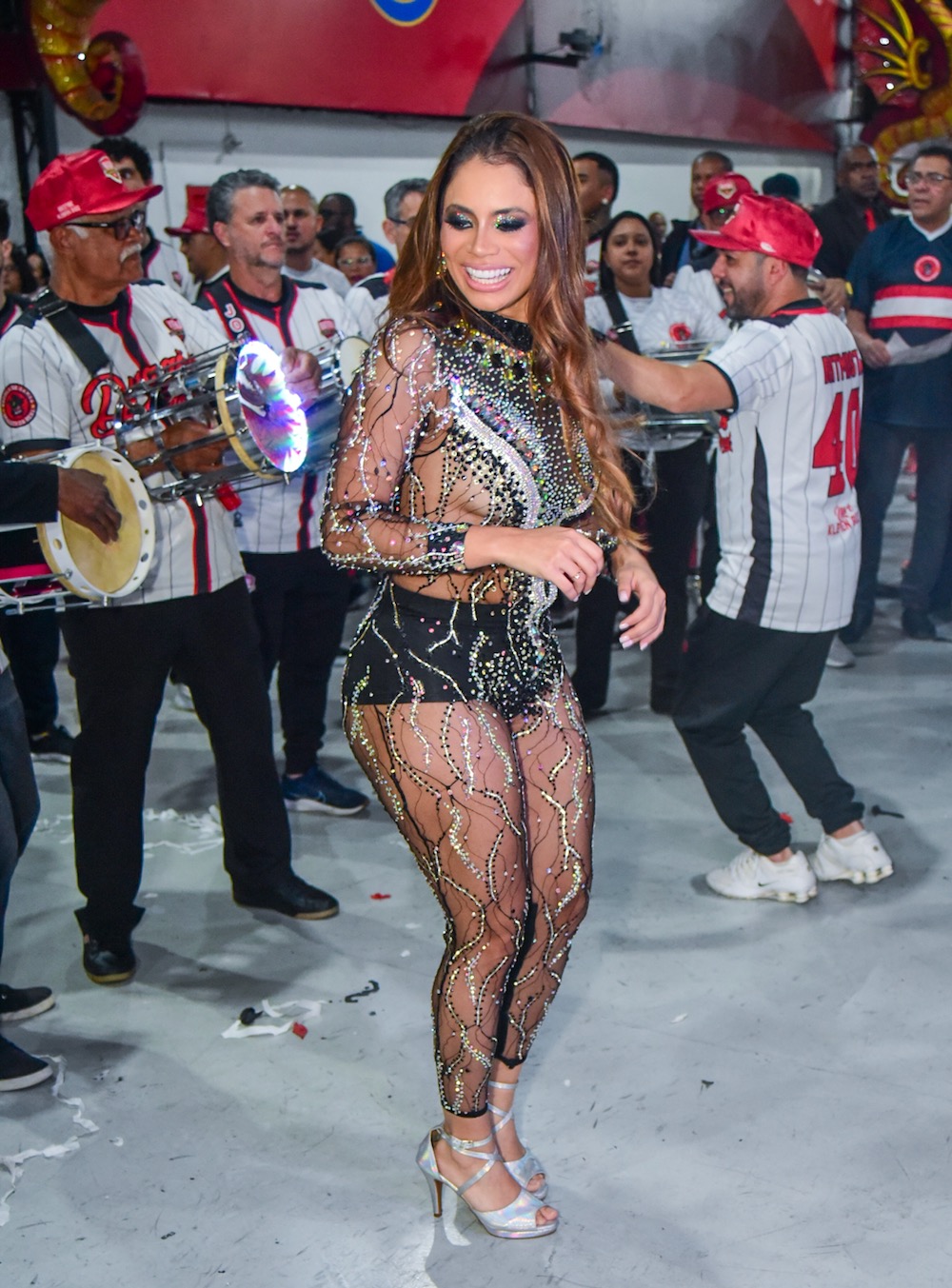 Com look brilhoso e transparência, Lexa marca presença na quadra da Dragões da Real