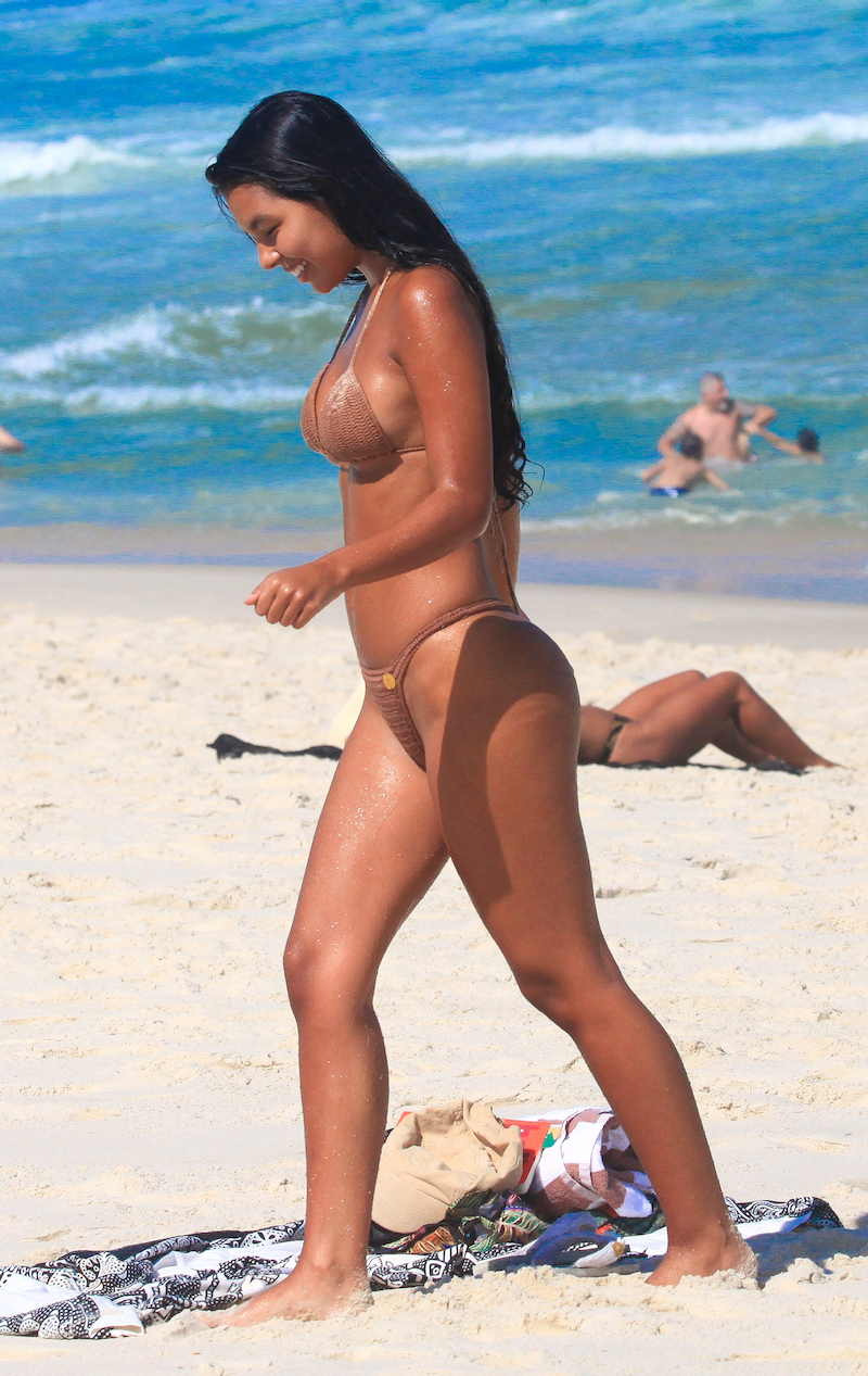 Mell Muzzillo, a Ritinha de ‘Renascer’, vai à praia de biquíni fio-dental