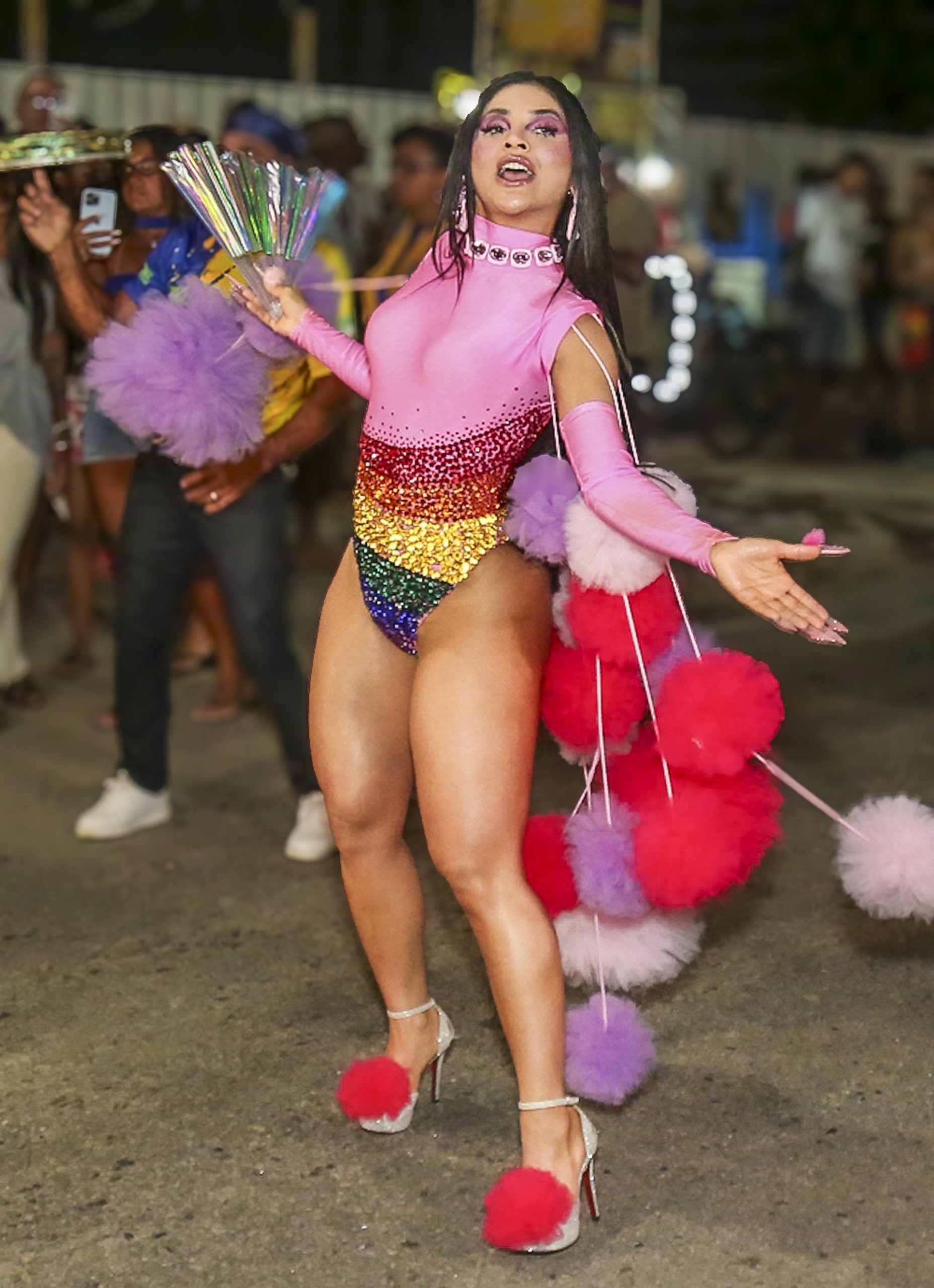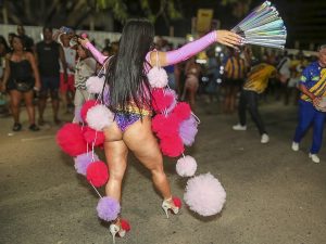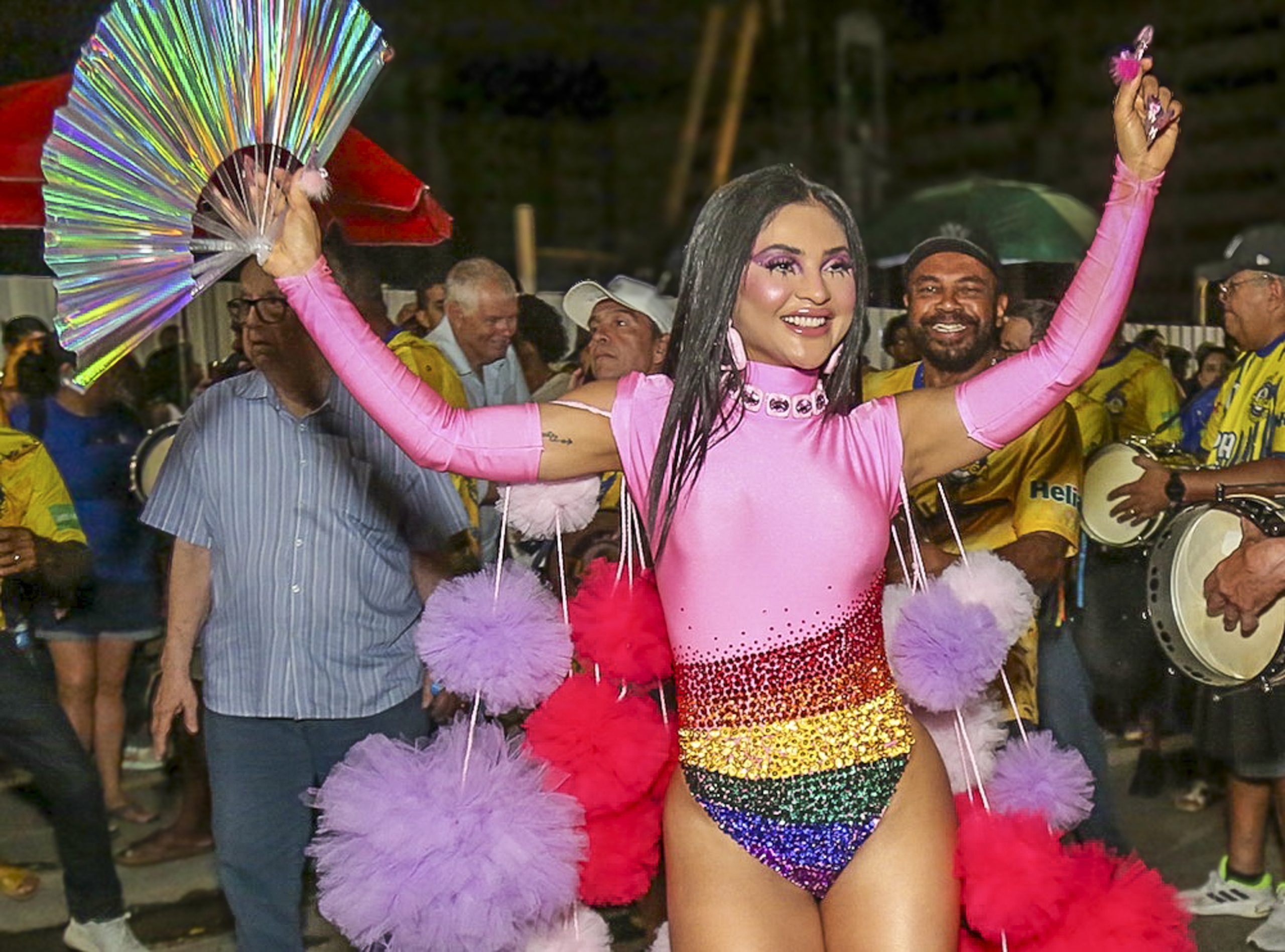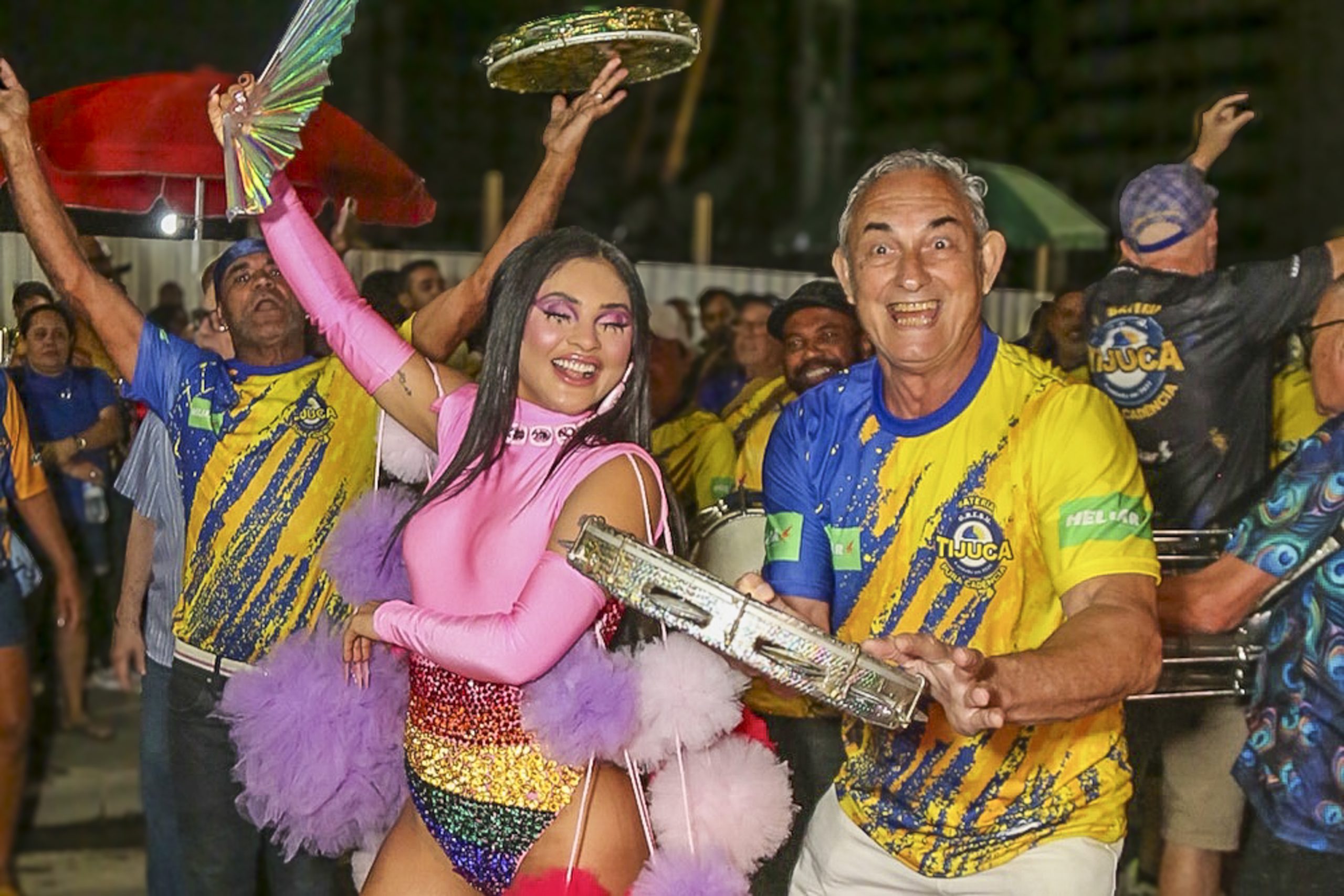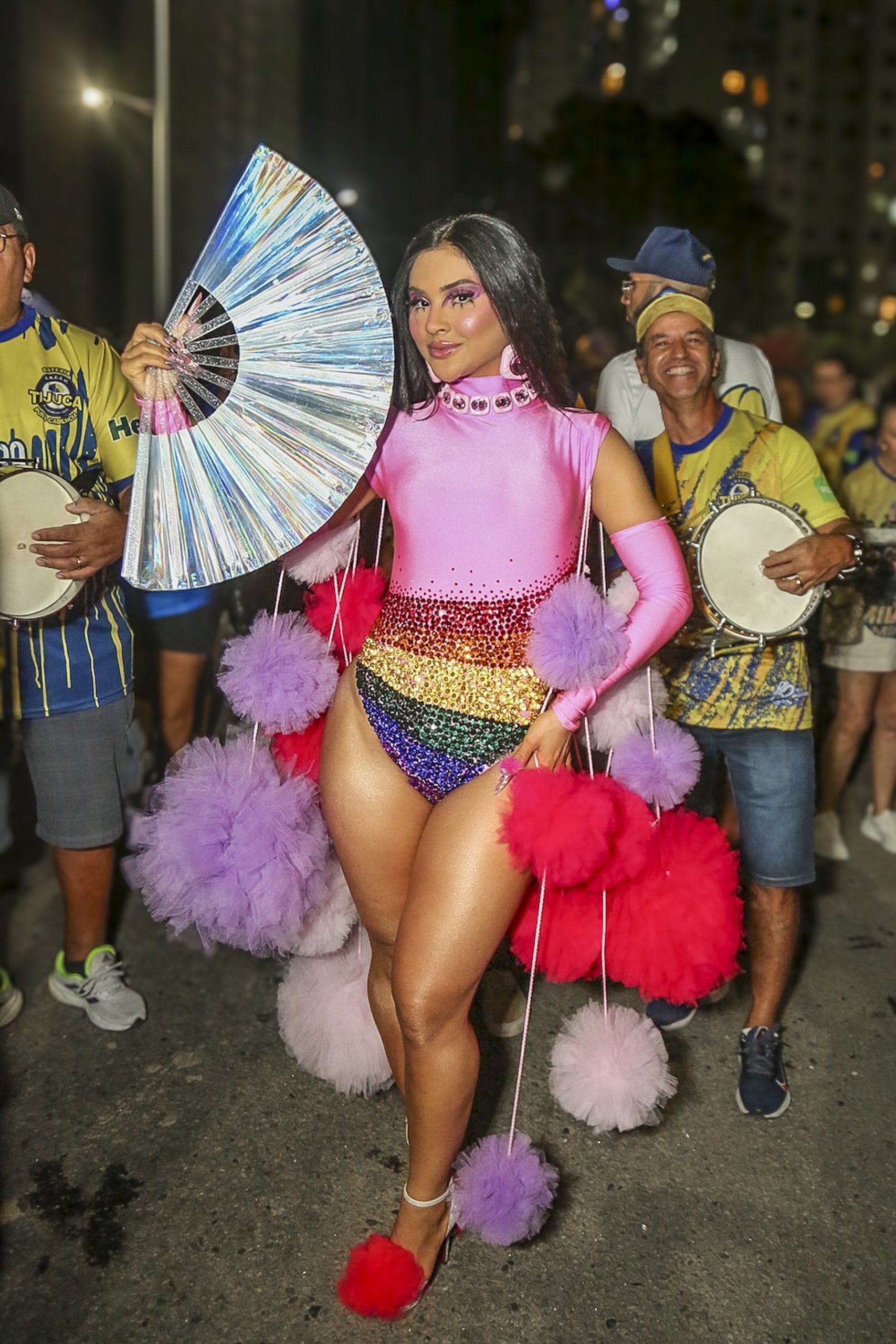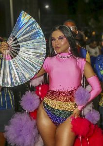 Mileide Mihaile, rainha de bateria da Unidos da Tijuca, brilhou no último ensaio de rua da escola na quinta-feira (11), usando um look vibrante e colorido em homenagem à comunidade LGBTQIAPN+.