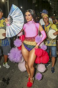 O look foi confeccionado em uma semana e conta com o styling de Lucas Andrade e design de Amaro Amorim, que fez o croqui. A ideia surgiu, também, em homenagem à Ala dos Ursinhos, tão tradicional e colorida na escola. “Quando entro na quadra ou na avenida, penso no quanto o Carnaval acolhe todas as histórias, todos os corpos e todas as formas de existir”, afirmou a rainha.