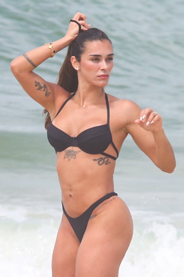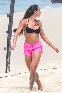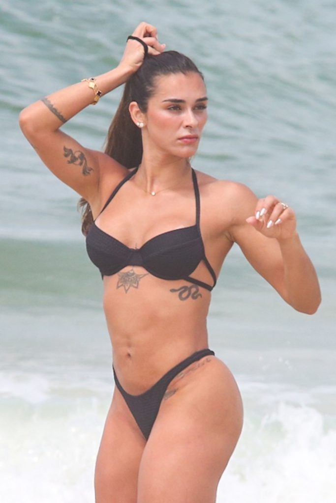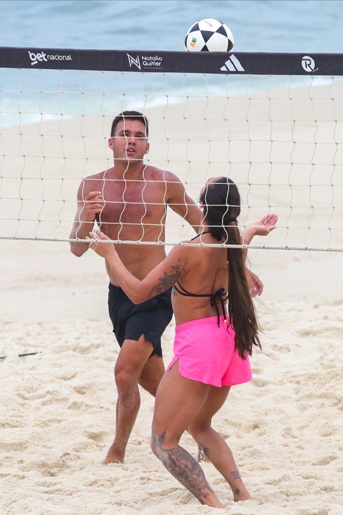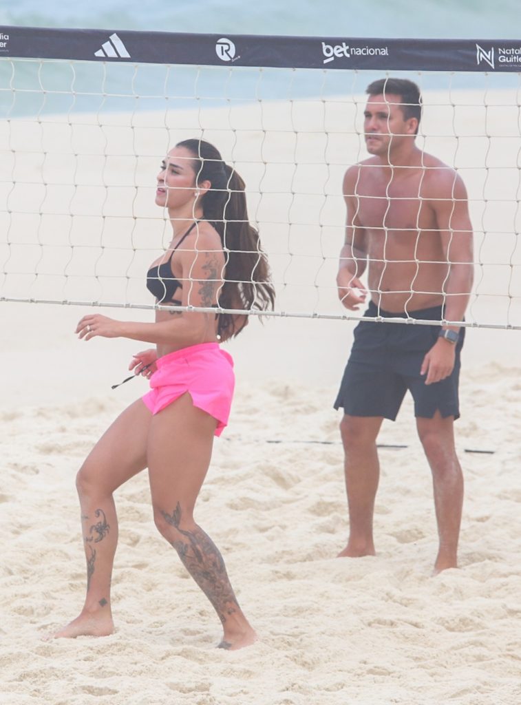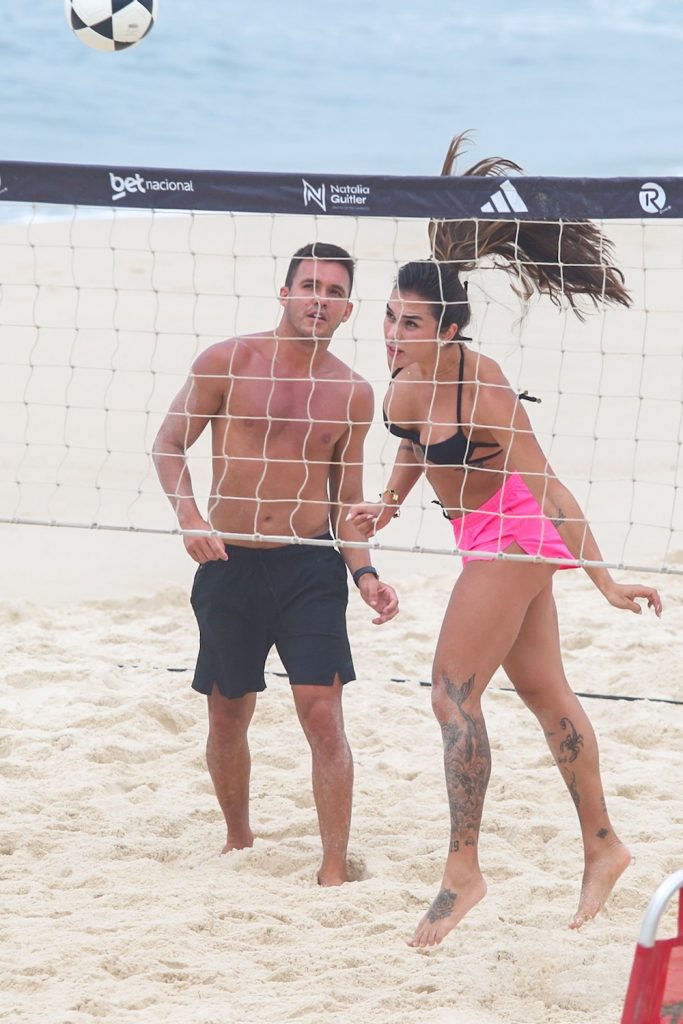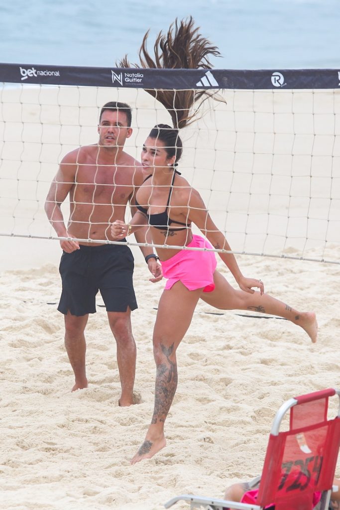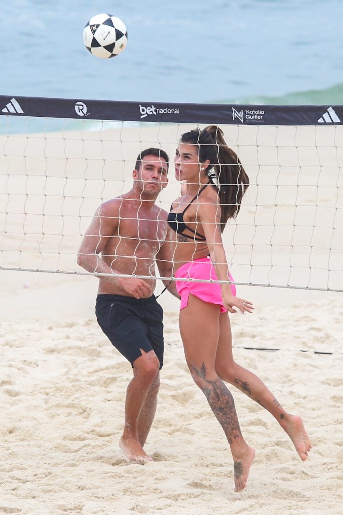 A esposa do jogador do Real Madrid, Éder Militão, apostou em um biquíni preto e short rosa para a atividade. Sorridente, mostrou bastante habilidade, com ombrada, peitada e chapada durante o treino.