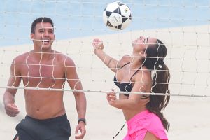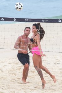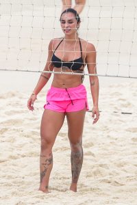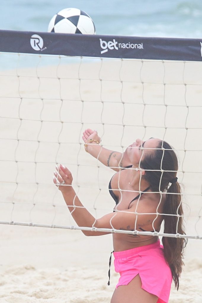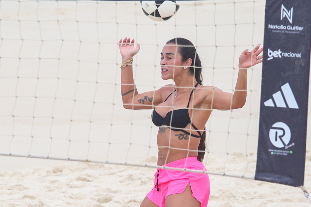 A influenciadora Tainá Castro Militão foi vista jogando futevôlei na praia da Barra no Rio