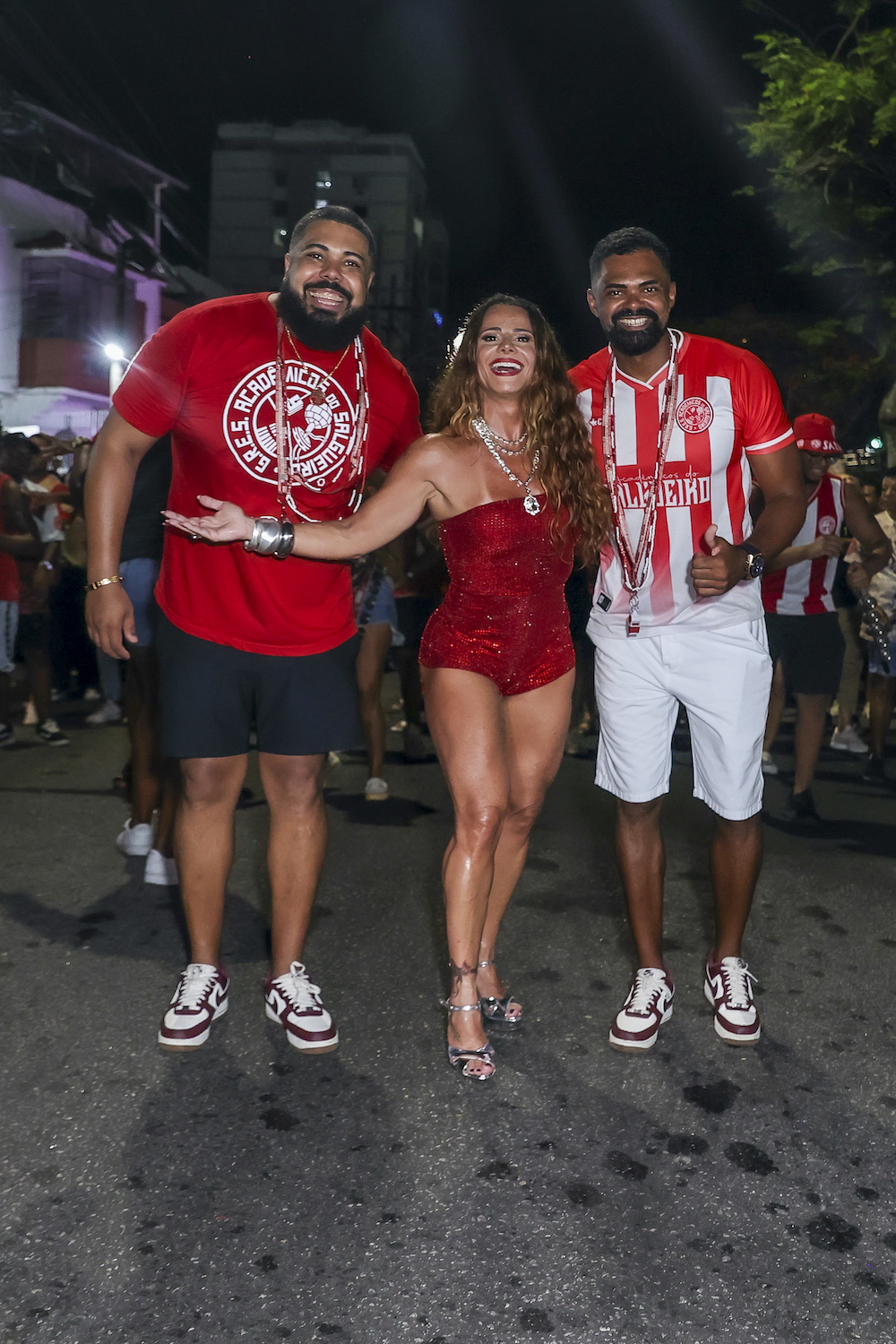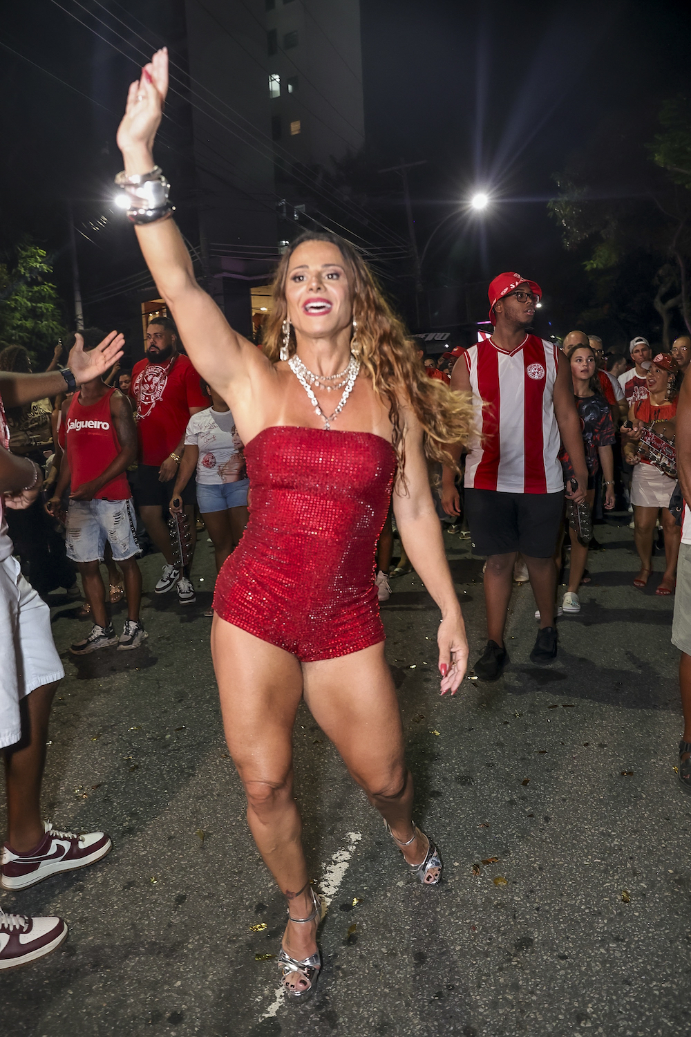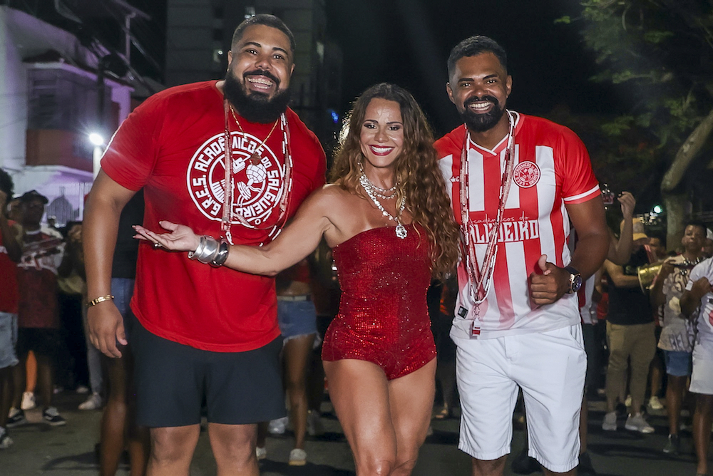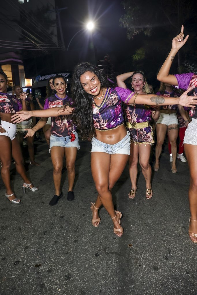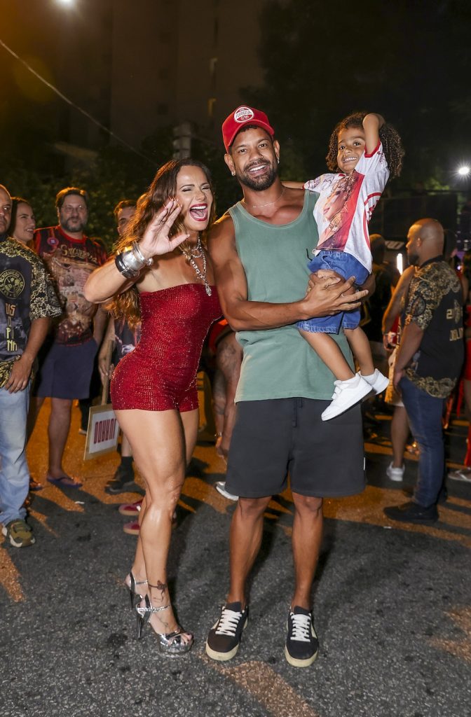 Viviane Araújo acompanha marido e filho no ensaio de rua do Salgueiro em 26