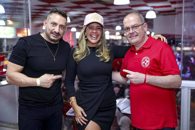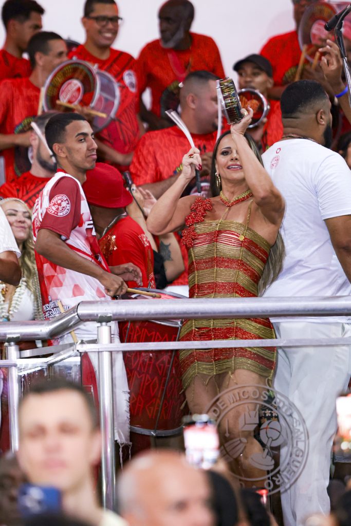 Para o evento, Viviane apostou em um vestido todo de fios que formavam listras vermelhas e douradas. Um salto alto vermelho completava o look. Durante a noite, a rainha de bateria não demorou para tomar seu posto e já pegou um tamborim para tocar com a Furiosa.